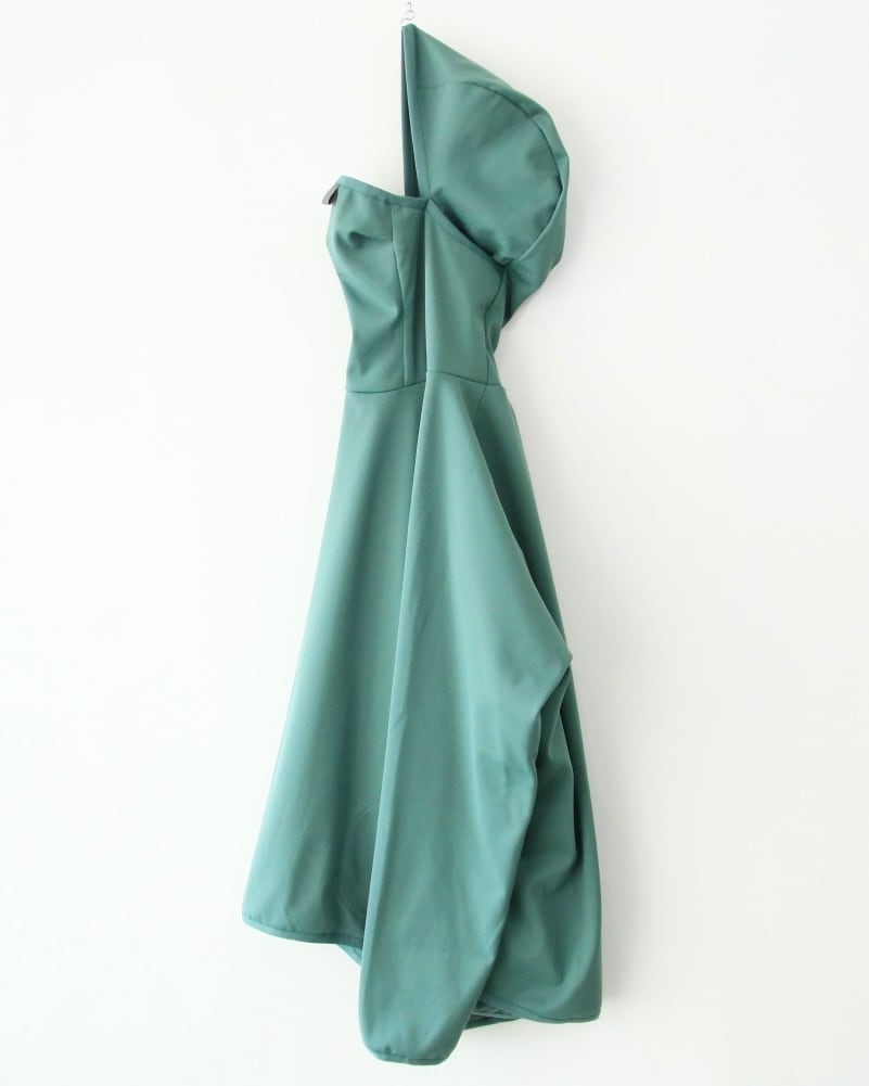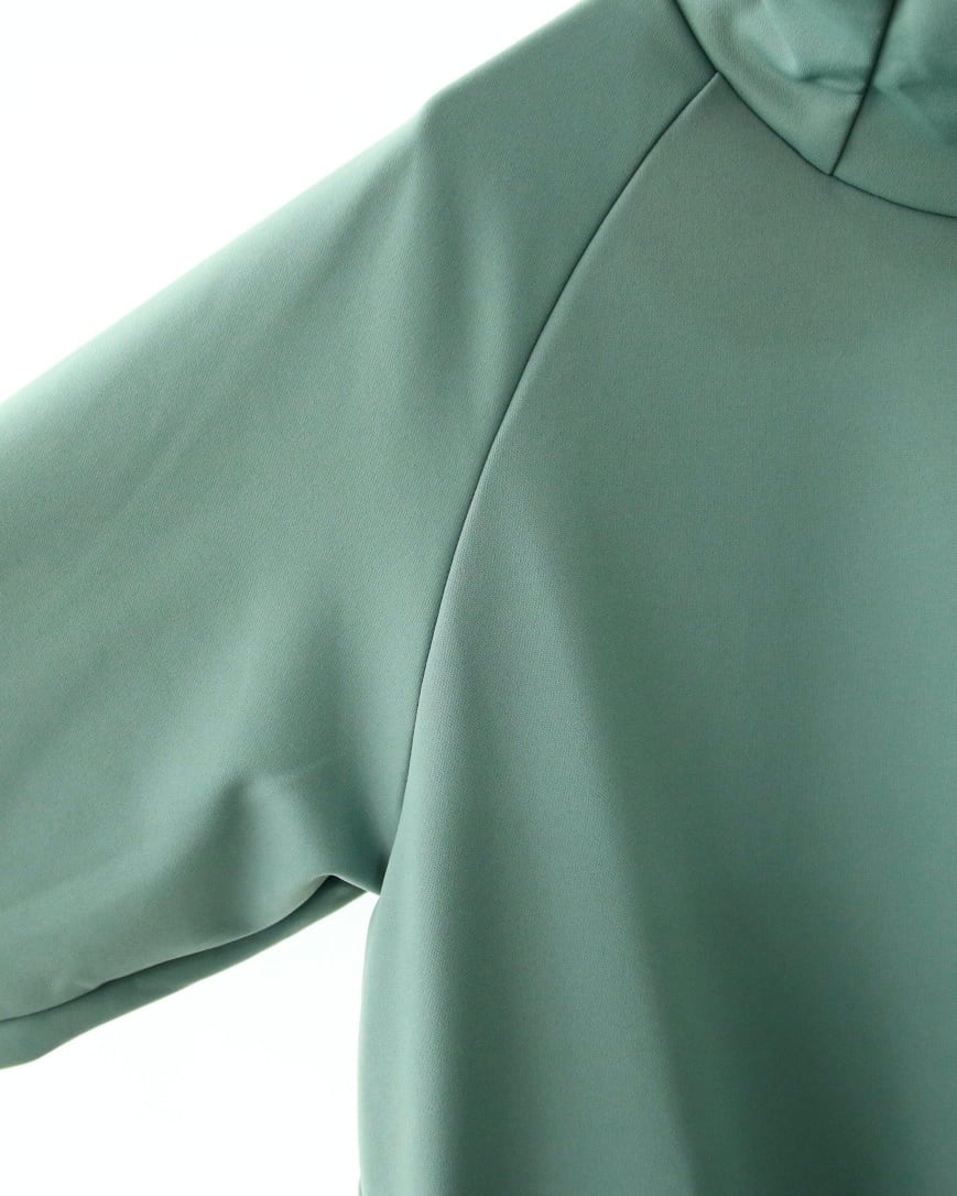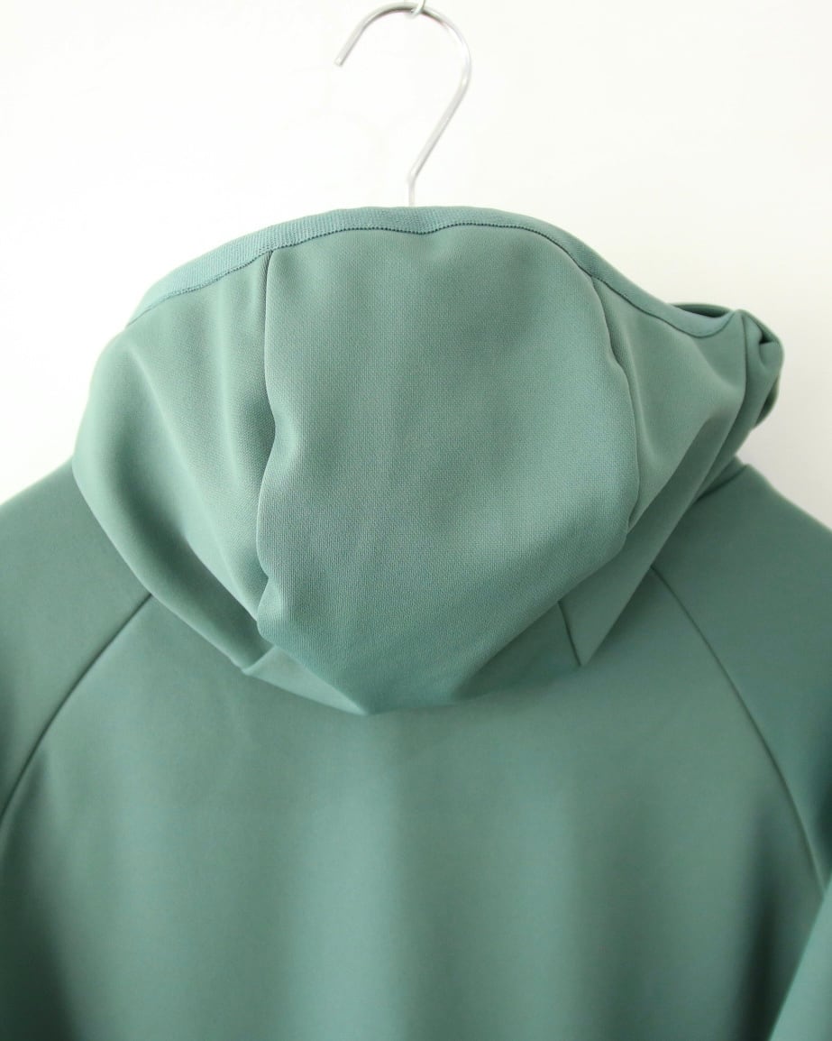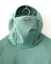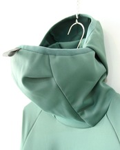 フードをかぶらずに、下ろしていると、タートルネックの様な、ハイネックの様な雰囲気になるんです。