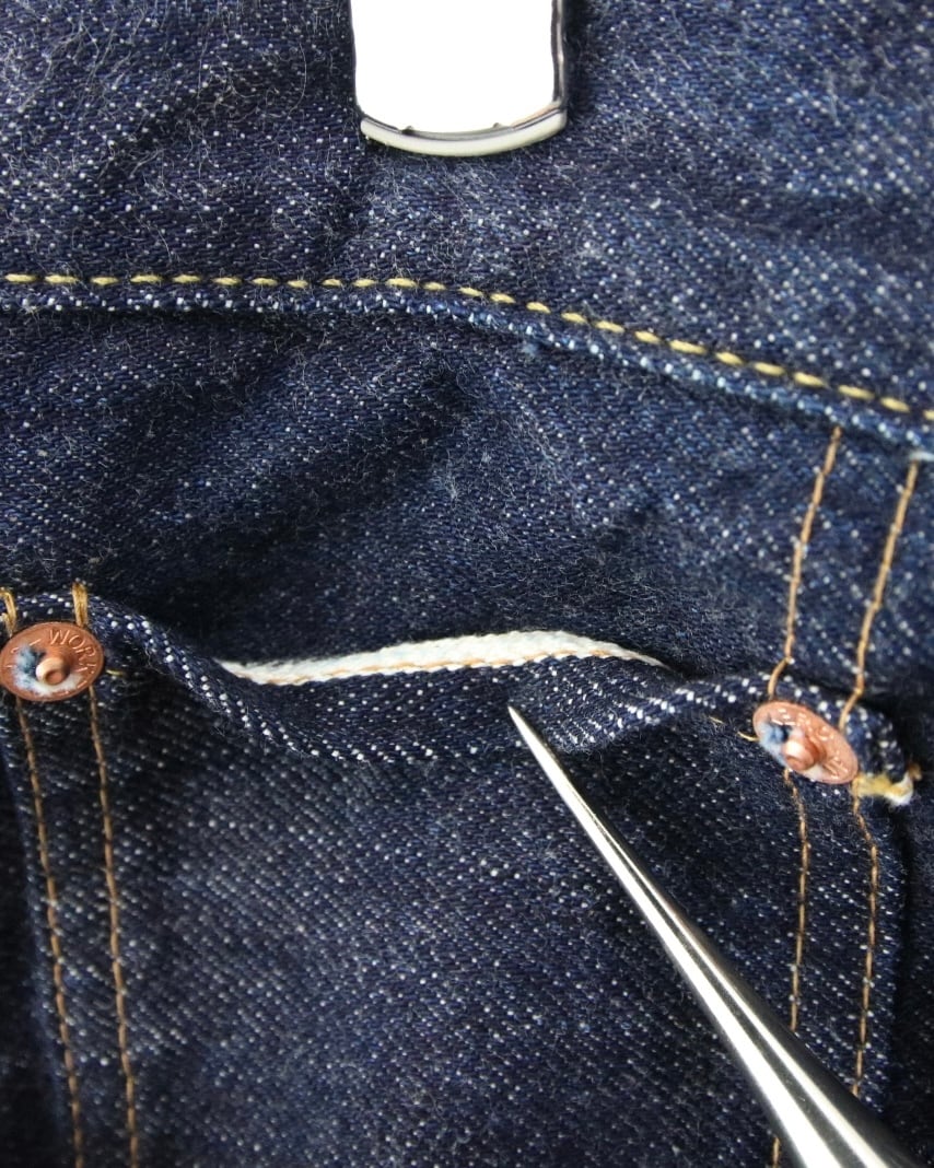 ジーンズの歴史で考えると、シンチバックが付いている物は古い物が多く、だんだんと実用性を考えて簡略化されていく中、同じ品番でも有り→無しと、移り変わっていったそうです。